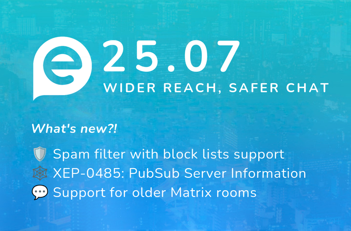 We are pleased to announce ejabberd 25.03, a big release with new features and many improvements, as it comes three months and 180 commits after ejabberd 24.12.